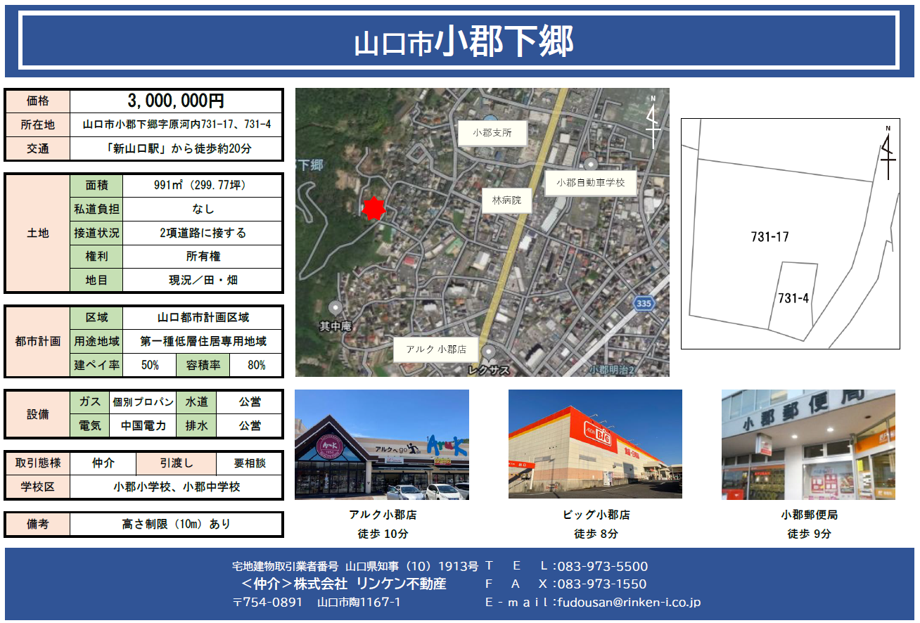 住 所:山口市小郡下郷731-17,731-4 面 積:991㎡(299.77坪) 価 格:3,000,000円 周辺環境:アルク小郡店 _____小郡郵便局 _____小郡支所